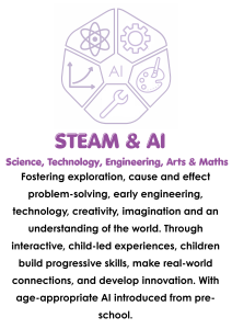 At Bright Little Stars, our bespoke learning programme nurtures every child’s curiosity and confidence with joyful challenge. We build strong foundations through the Prime Areas and extend thinking with Early Mathematics and Early Literacy. Children explore First Steps in STEAM & AI, grow through Mind, Body & Expression and thrive in Outdoor Learning. They progress through our School Ready Programme, Communication & Languages, and Arts & Imagination. Above we celebrate curiosity and joy to bring play and teaching together.