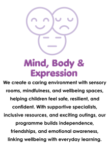 Forest School- Rain-or-shine, hands-on outdoor learning that builds risk awareness, decision-making and child-led exploration. Sensory walks, foraging, woodwork and safe tree climbing, deepening children’s understanding of their world.
