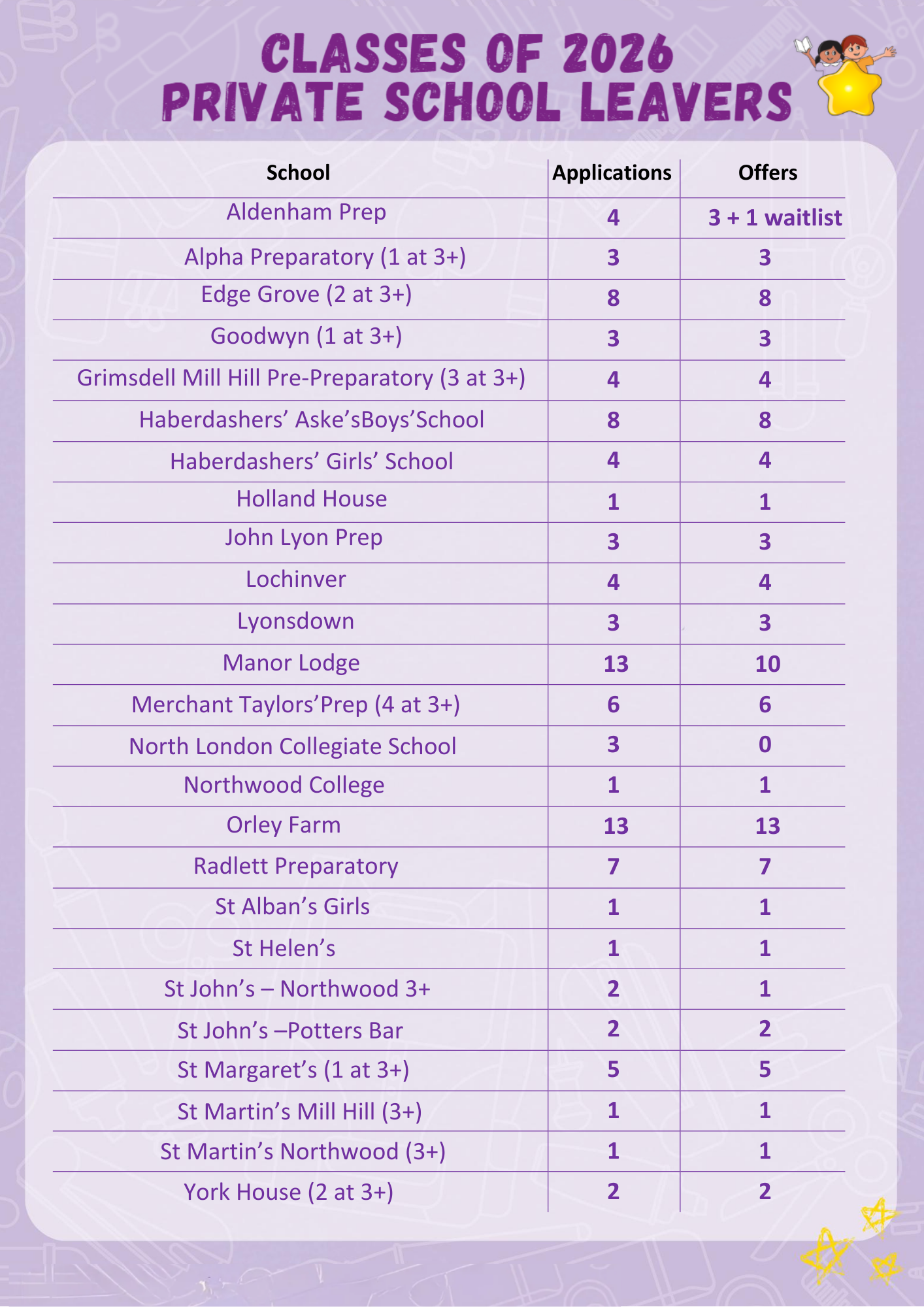We’re proud to share another successful year of school applications, including a 100% success rate at Habs Boys and Habs Girls for entry 2026. Our leavers secured offers from a wide range of highly regarded independent preparatory schools, with most children receiving multiple offers and many families gaining places at their preferred schools. These outcomes reflect the impact of our 4+ Academic Success Sessions and School Ready Programme, alongside the tailored guidance we provide to each family and our strong relationships with schools.